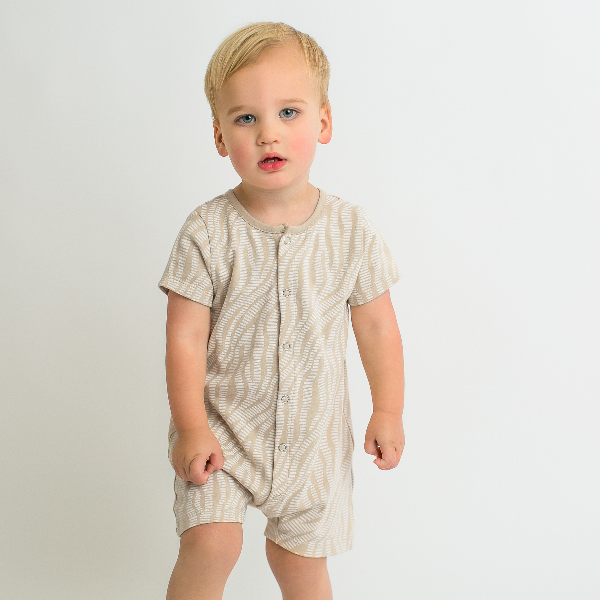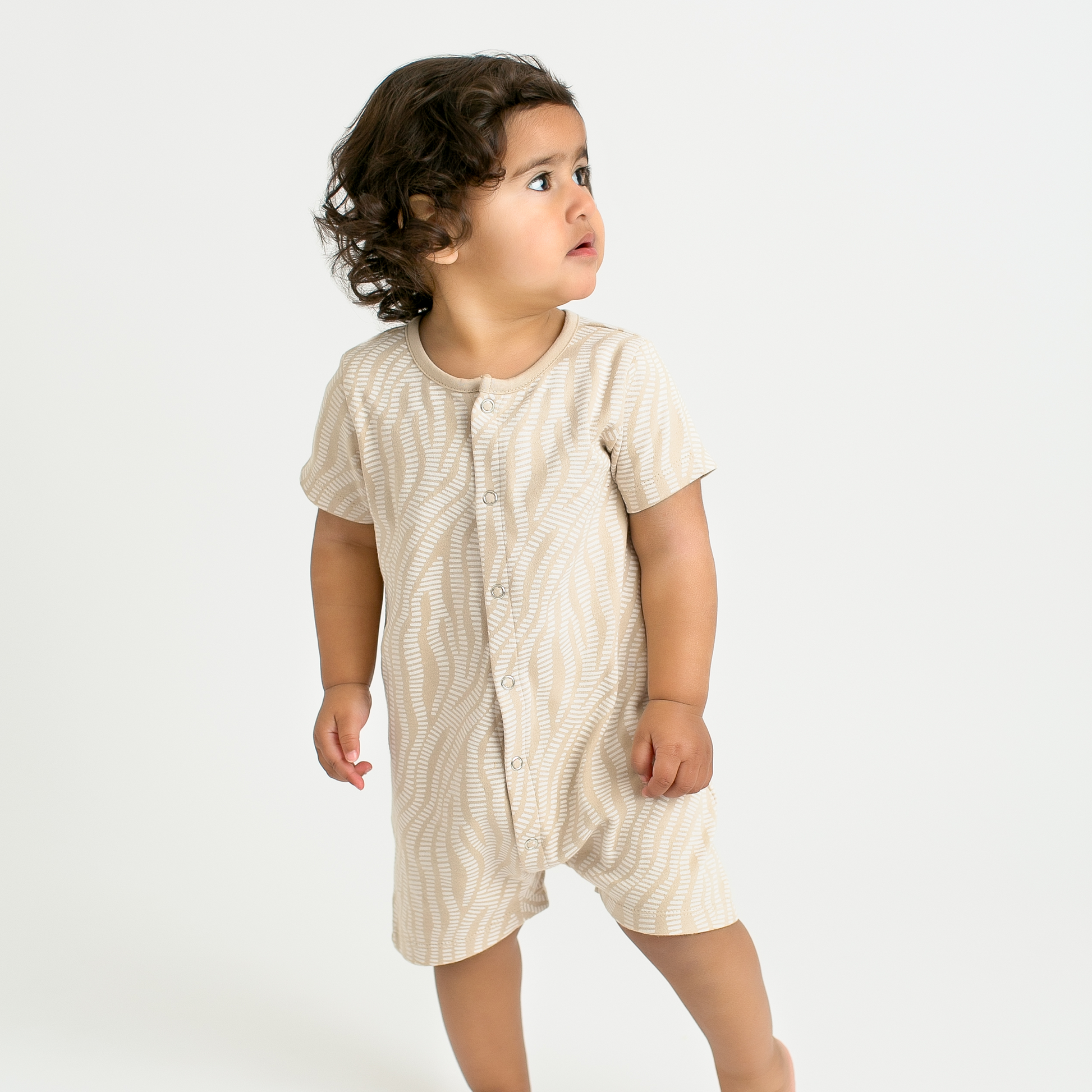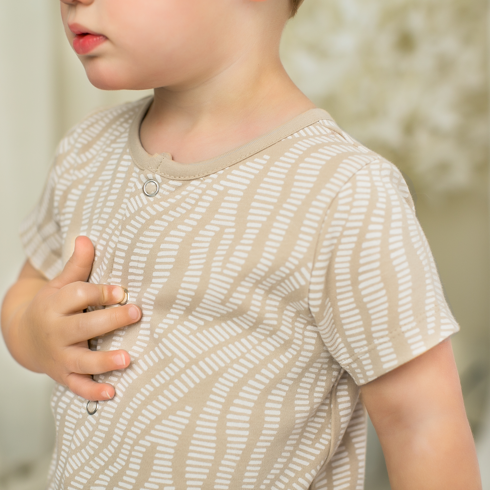 Our short sleeve romper is made from high-quality Organic Cotton, ensuring a soft and gentle touch against your little ones skin. It features a long front button opening for making diaper changes a breeze.